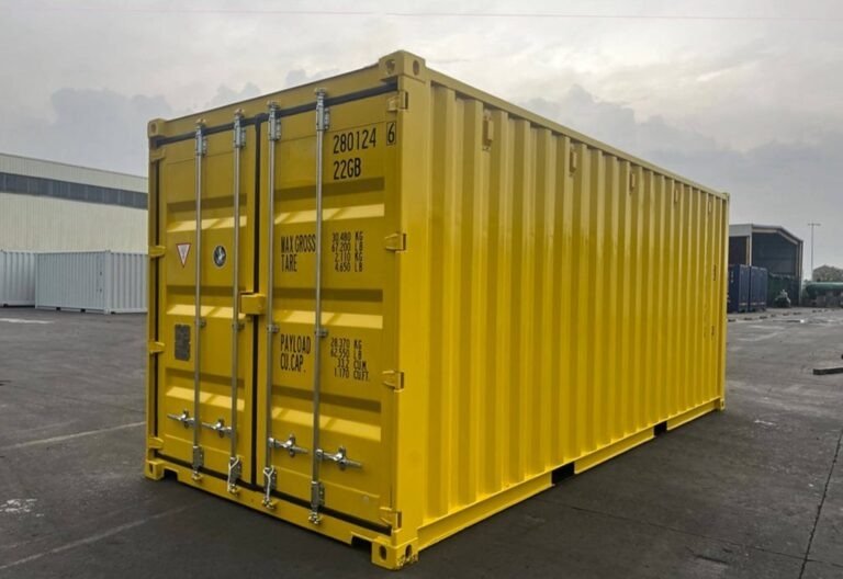 Contenedor de transporte estándar de 20′ con certificación IICL y color RAL 1023. Solución confiable para transporte marítimo y terrestre.